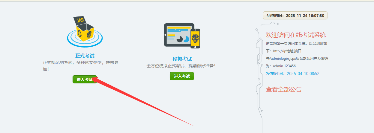 在系统首页(特征url为talk/ExaminationList.jspx?type=1)的页面点击正式考试